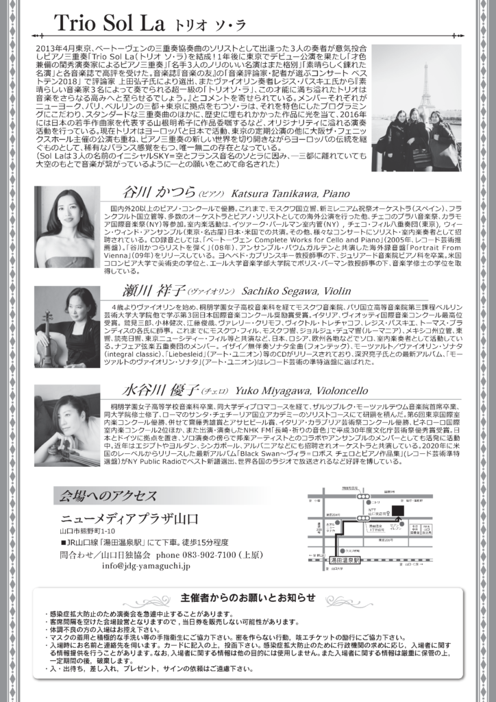 結成したトリオ「Trio Sol La(トリオ ソラ)」によるピアノ三重奏のコンサートのご案内です。